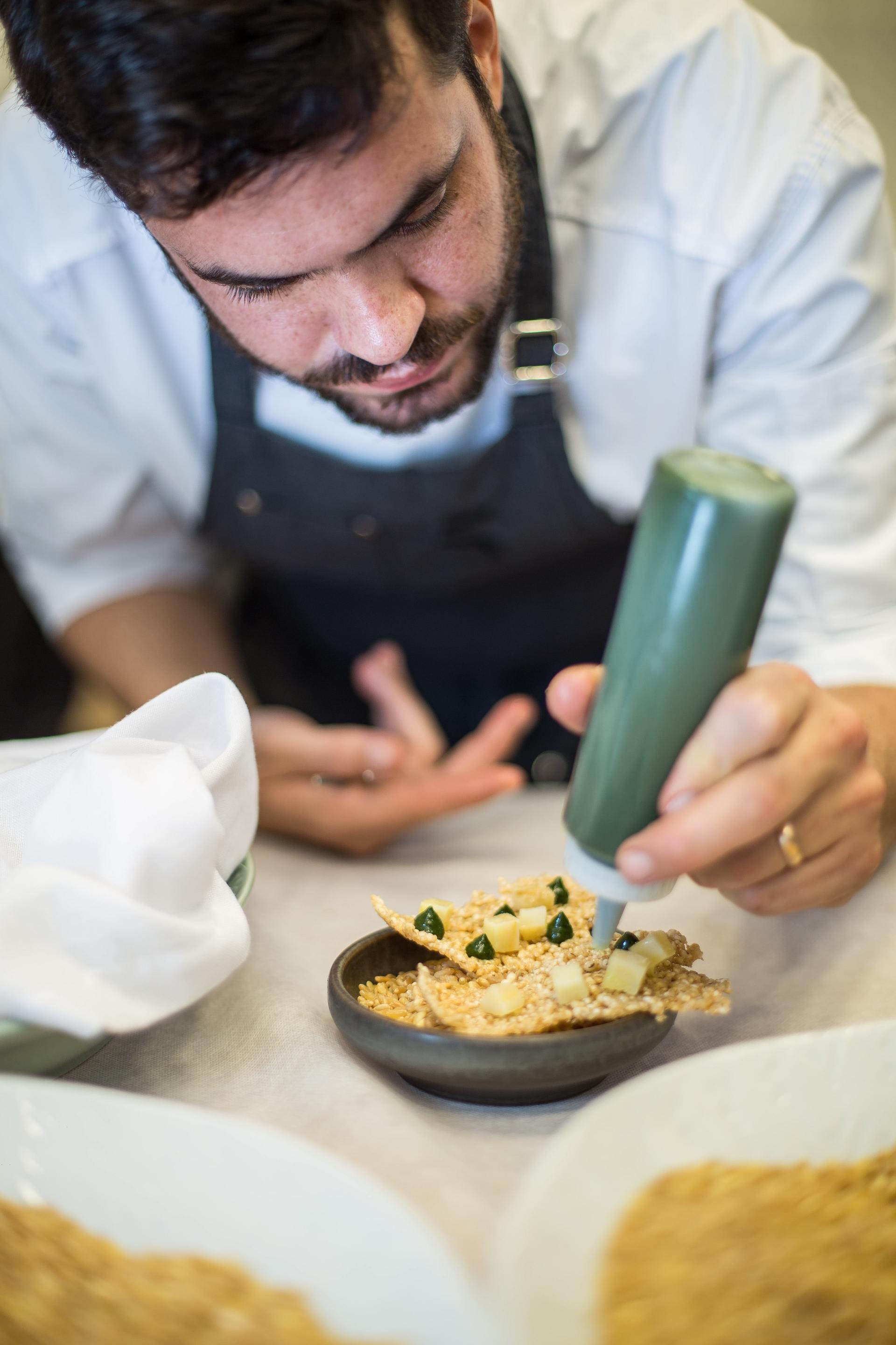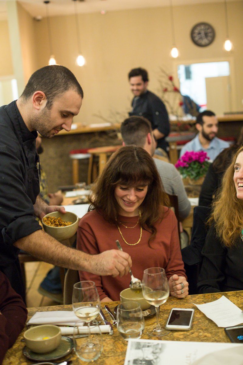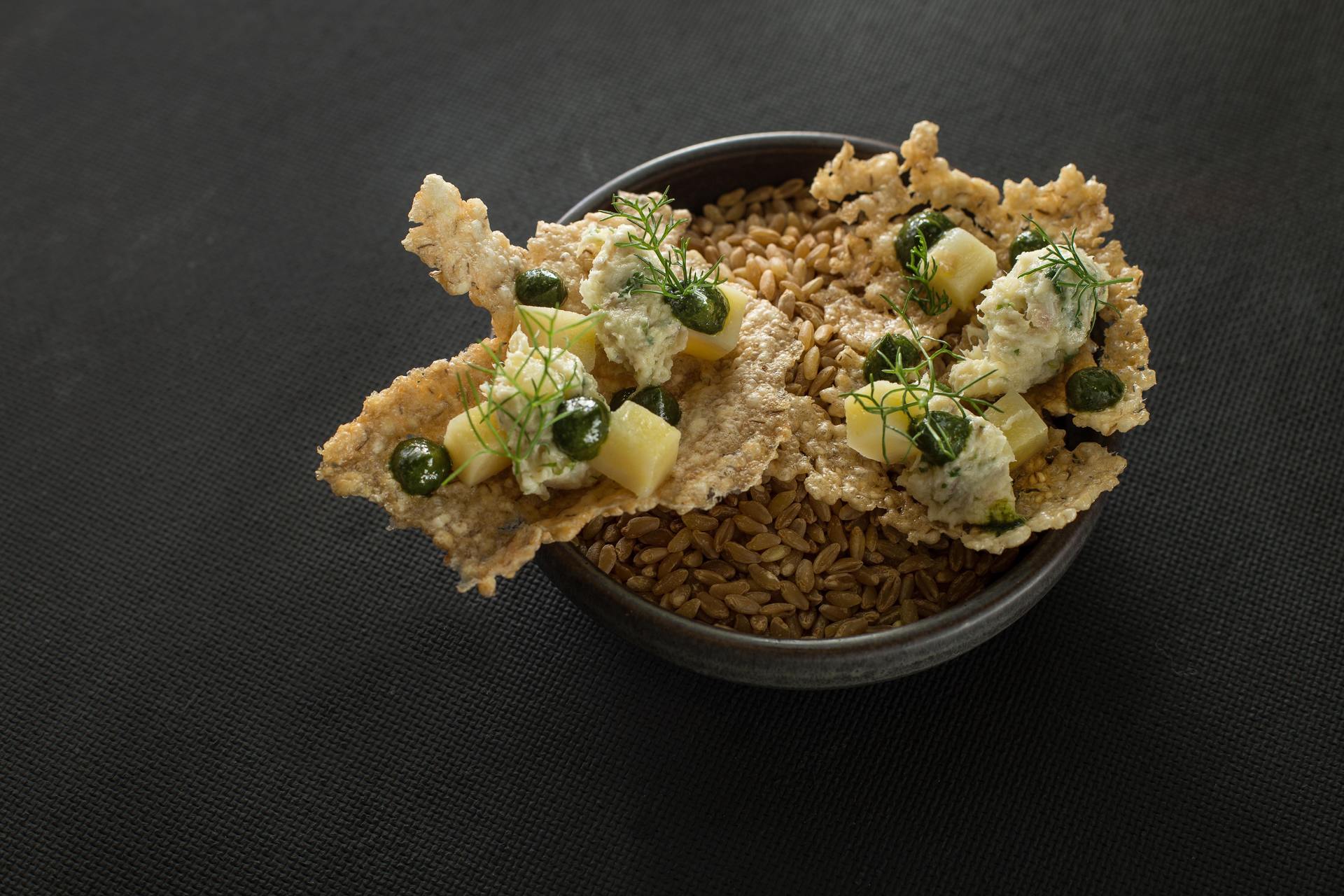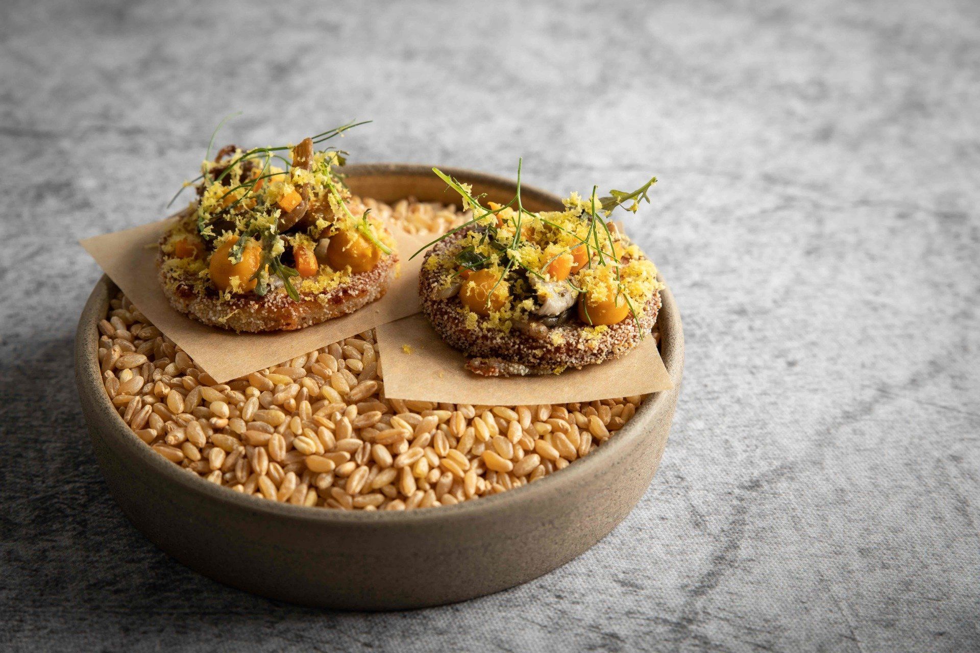 ריזוטו כוסמין, קרם קשיו ועשבים, קצף דלעת וקרמבל של כוסמין ושמרי בירה