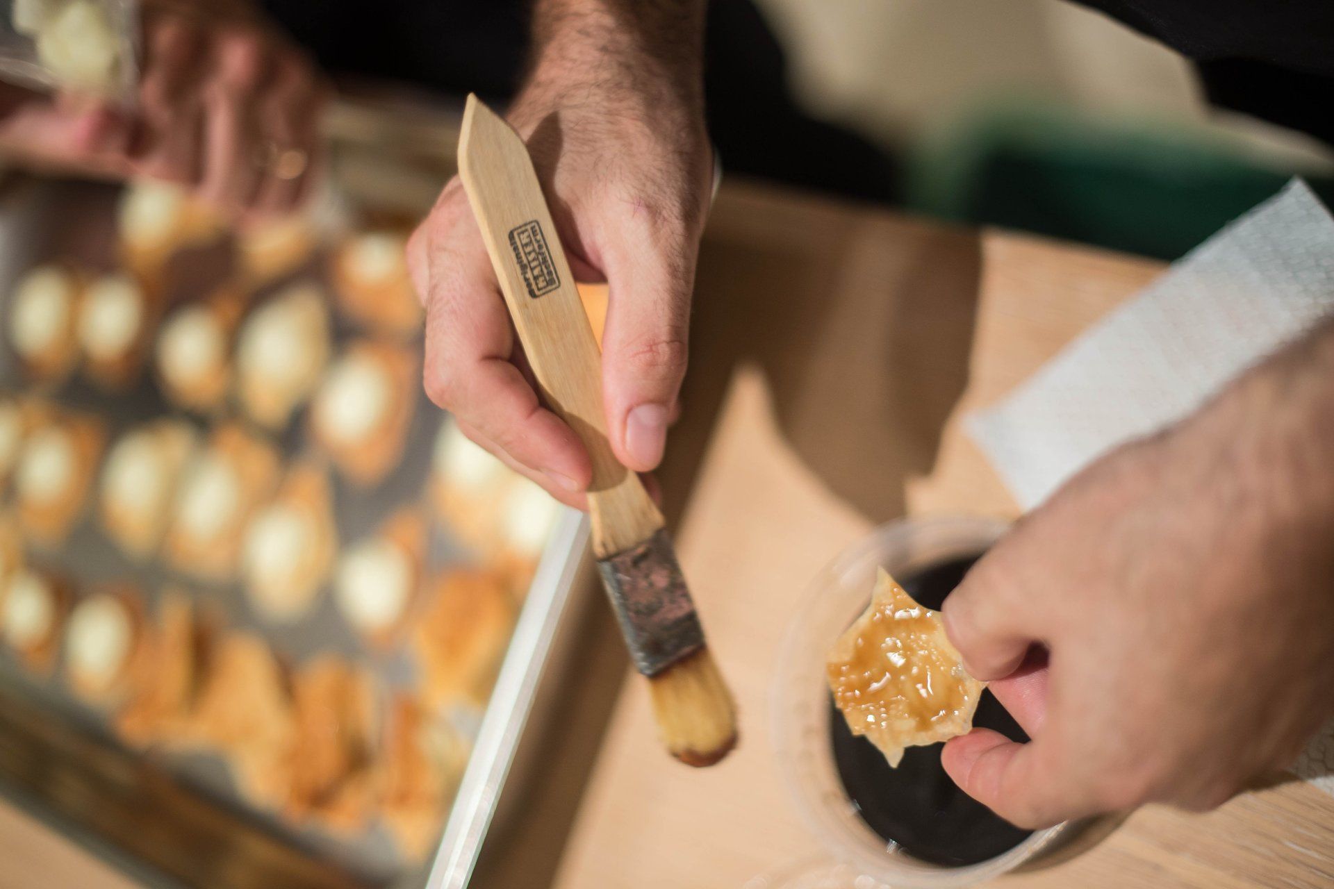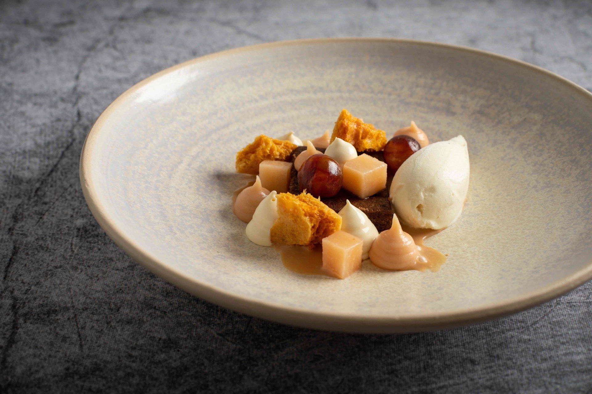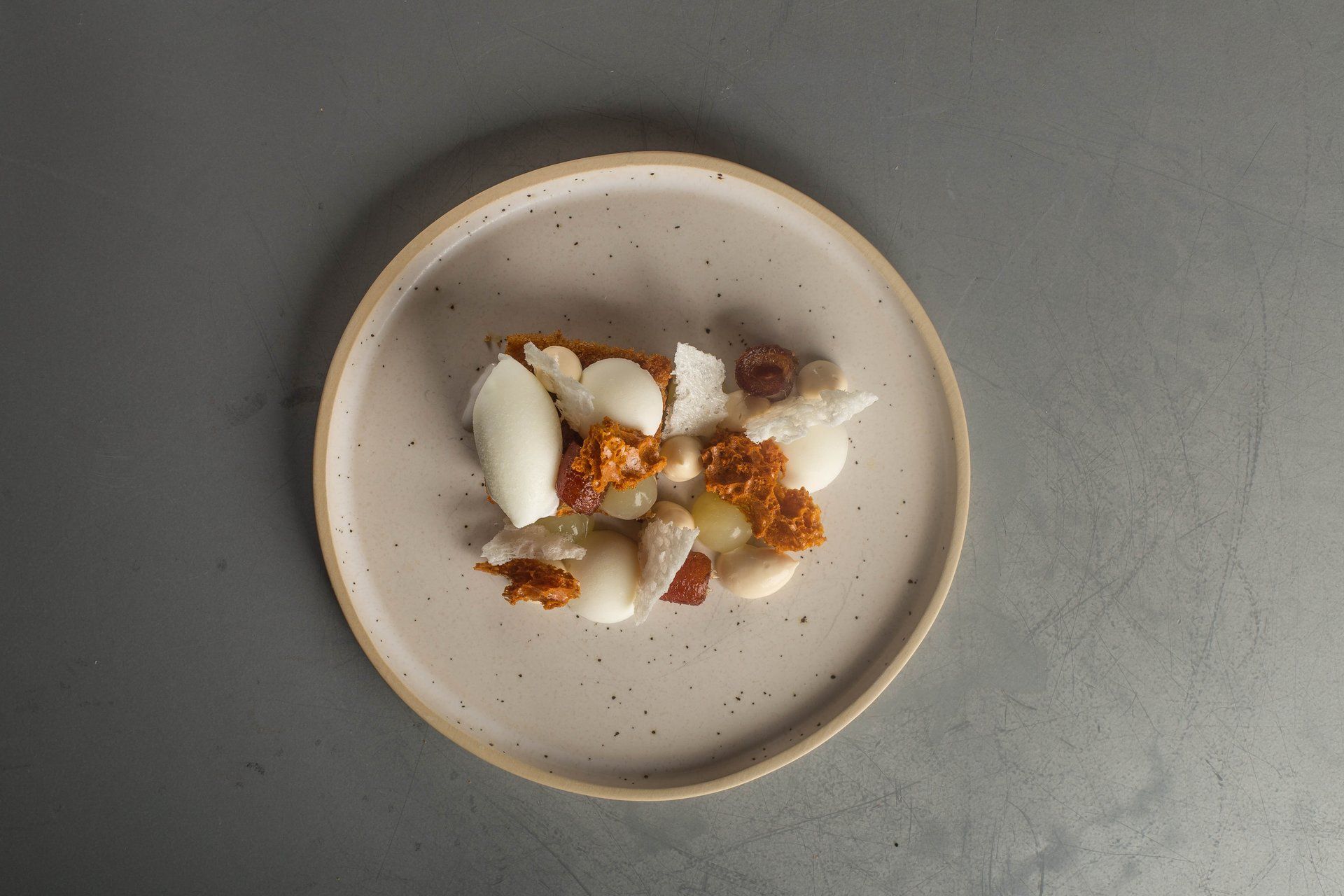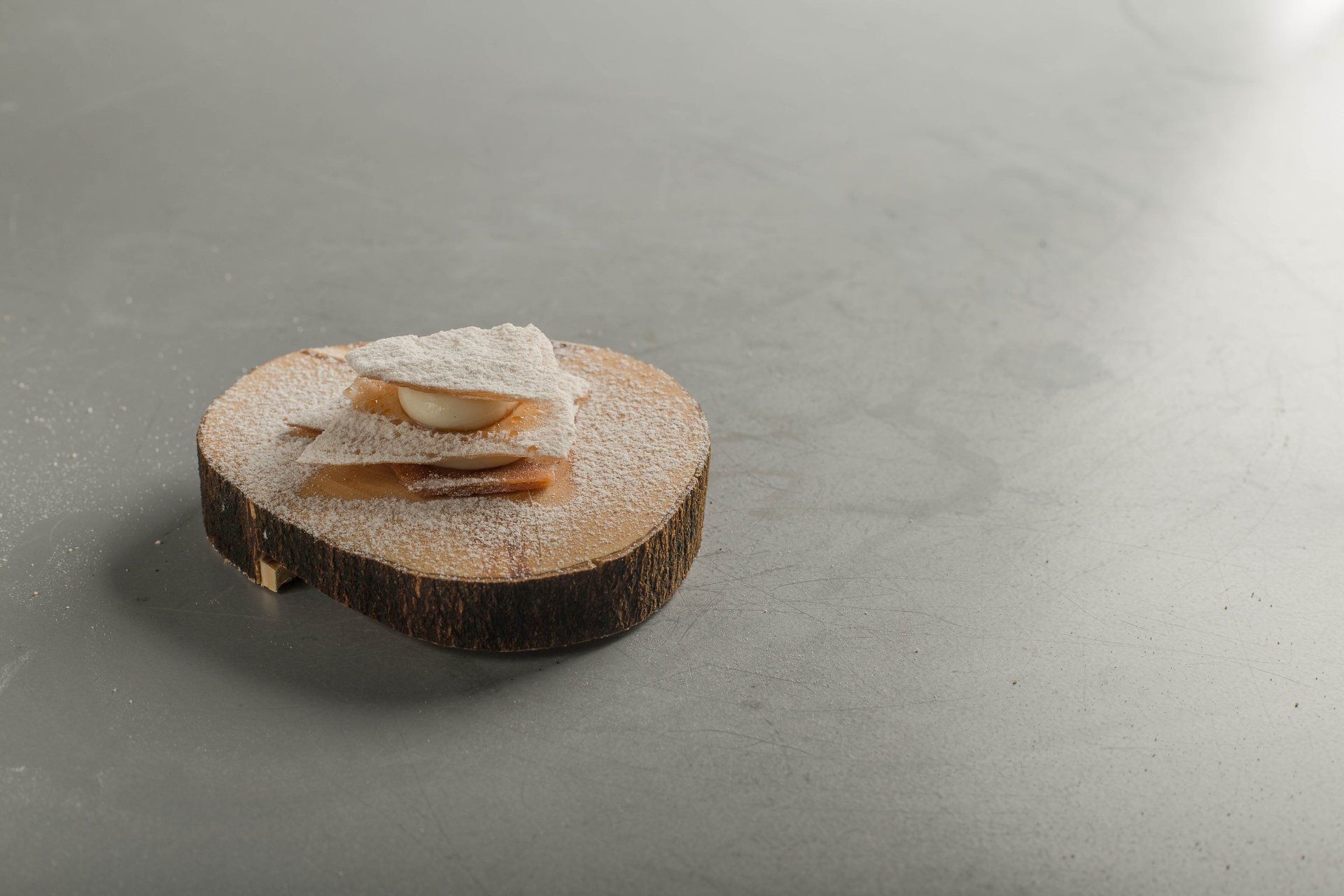 קרמשניט אסייתי - בצק פילו מקורמל במירין, פטיסייר שוקולד לבן ווסאבי, אבקת סויה לבנהButton