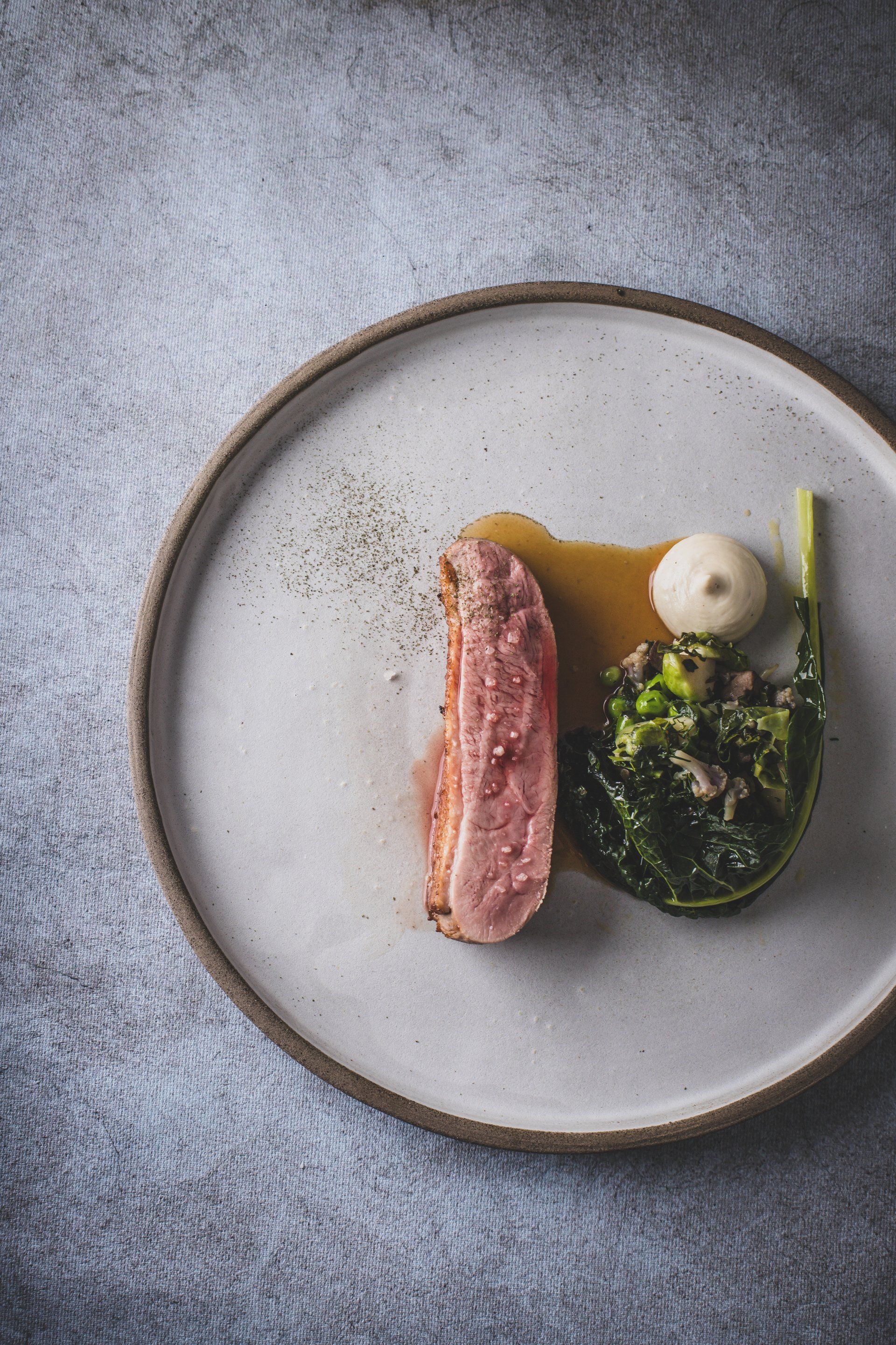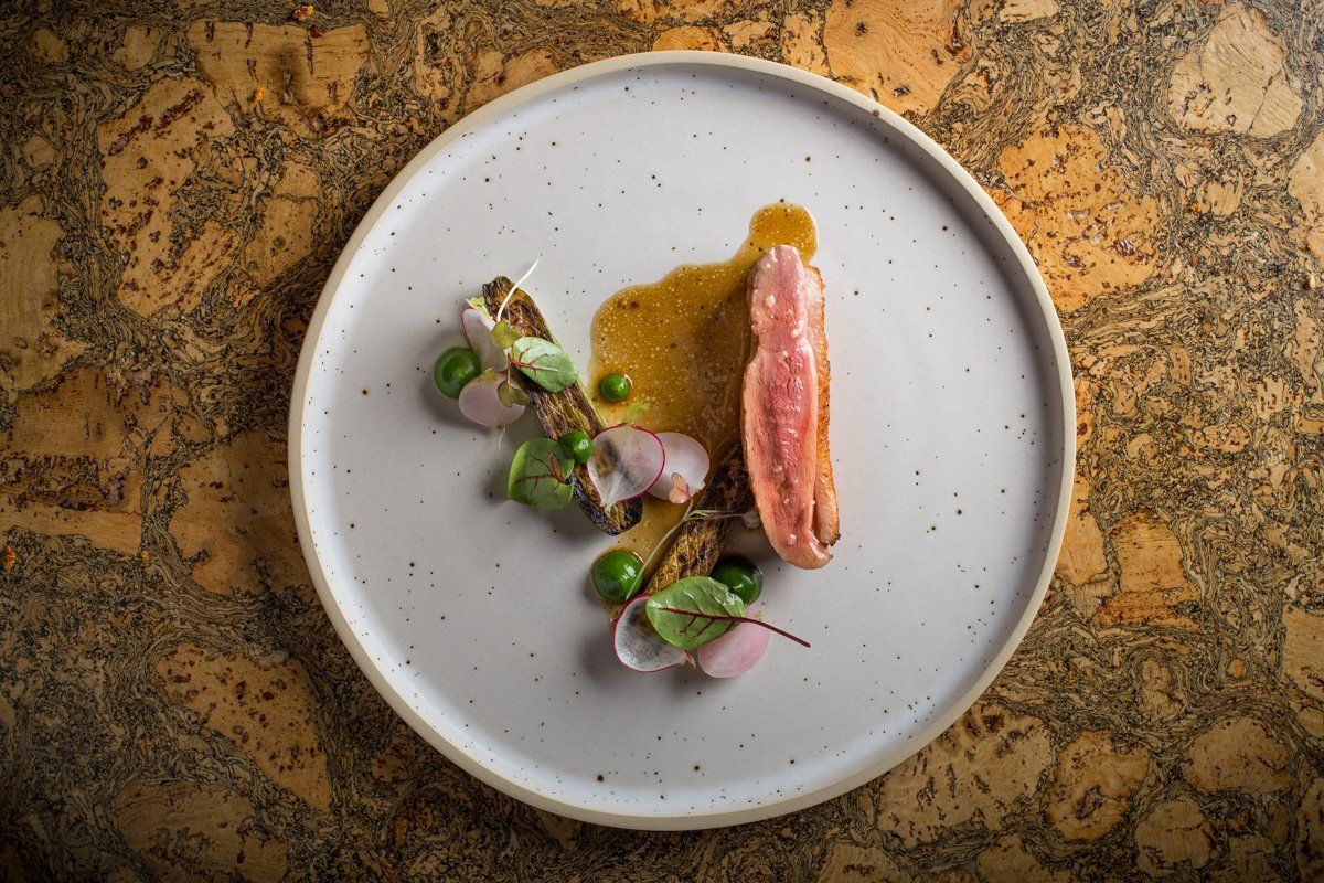 חזה ברווז, זוקיני צעיר, קרם פטרוזיליה, רוטב ציר ברווז וייןButton