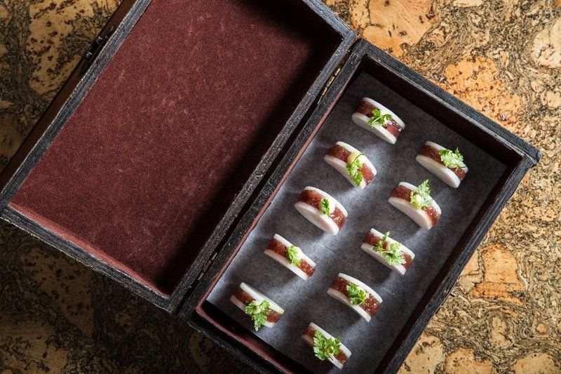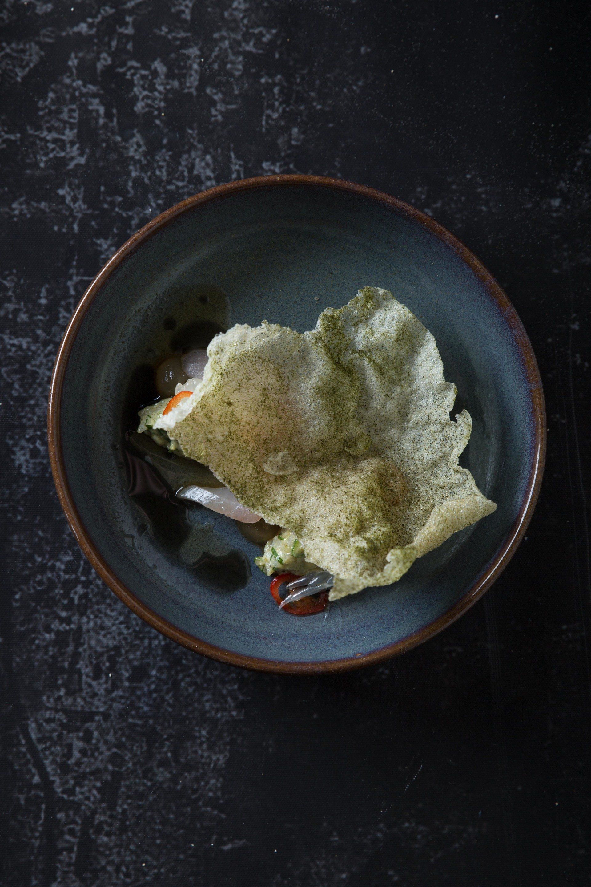 ניגירי אינטיאס, אורז, אבוקדו, פומלה, מיונז מיסו, טוויל אורך פריך, קונסומה הדרים ואצותButton