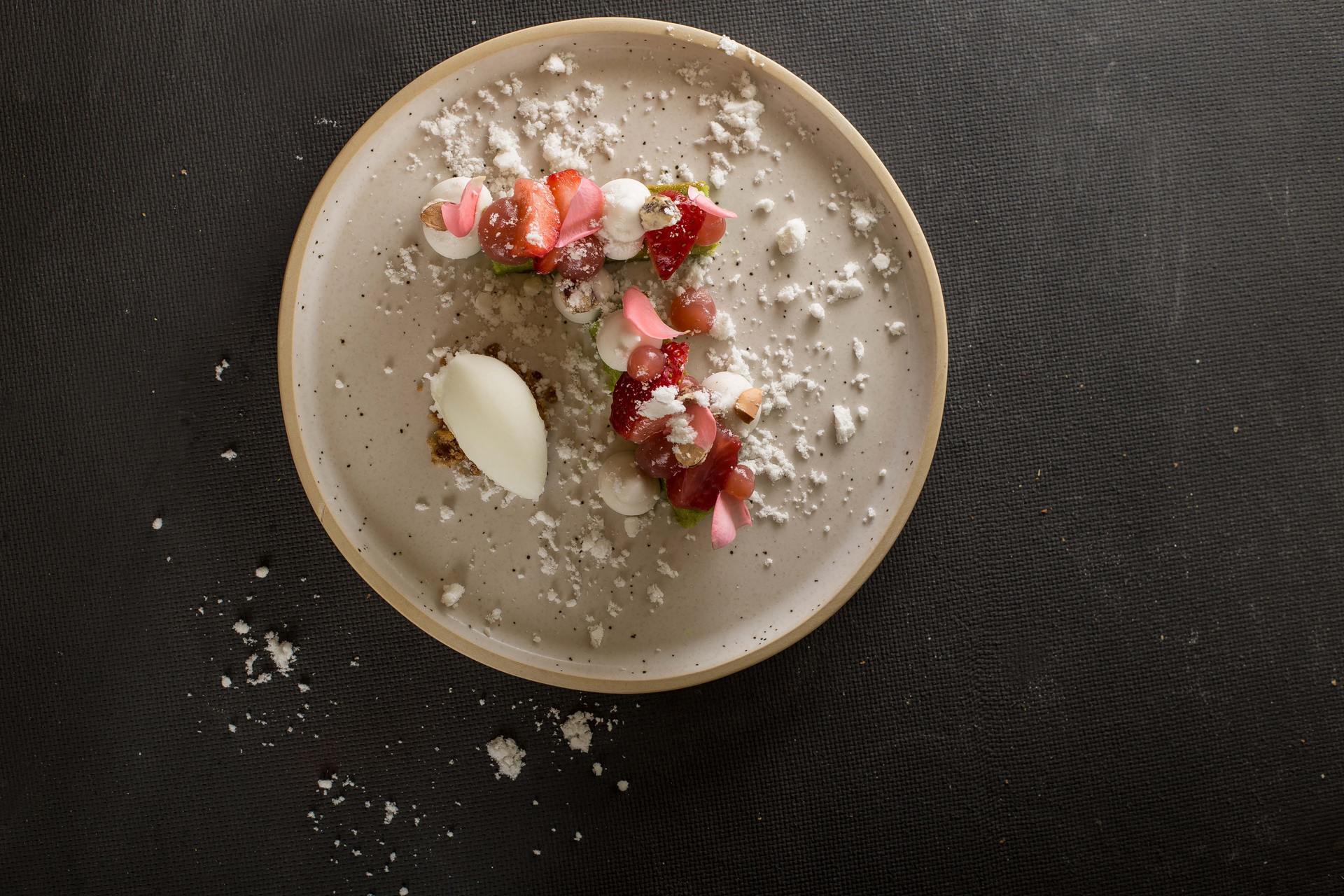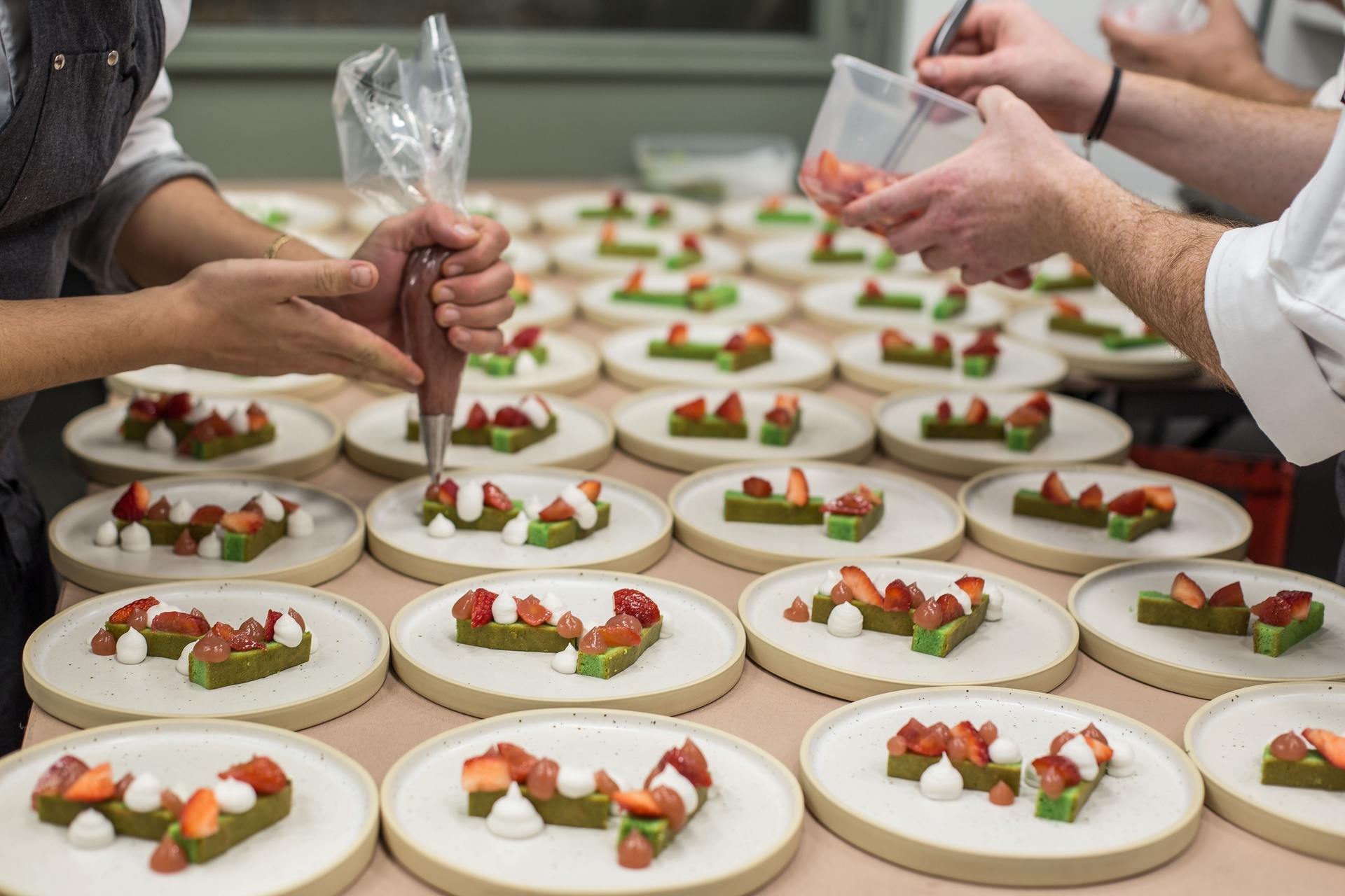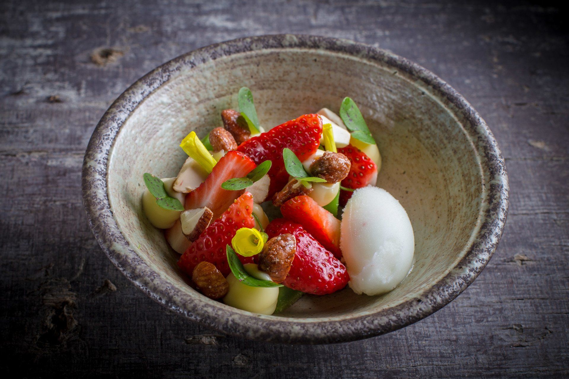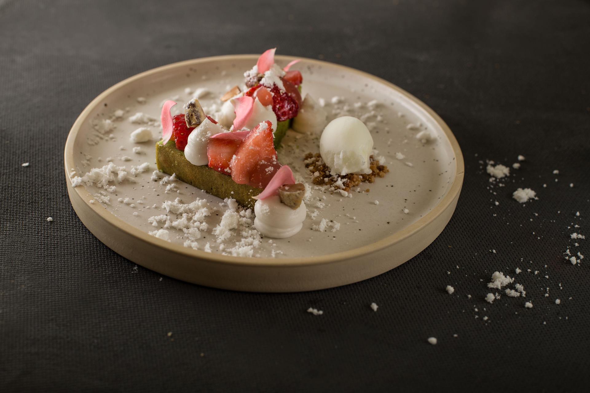 עוגת פיסטוק לחה, תותים טריין, קרם קוקוס וסורבה ליים