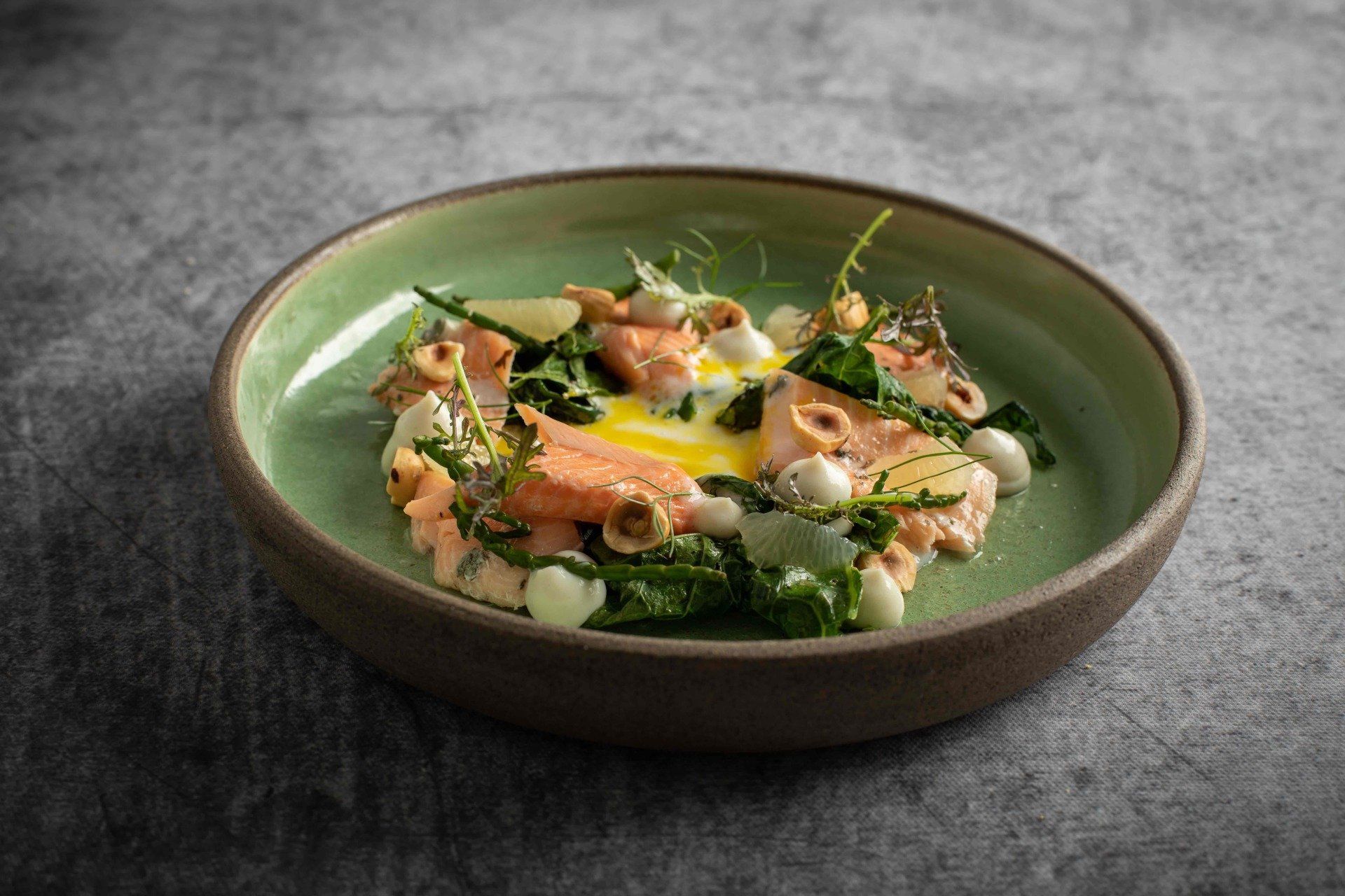 פורל ישראלי בעישון ביתי, אגוזי לוז, קרם חלב וזעתר, שמן חרדל