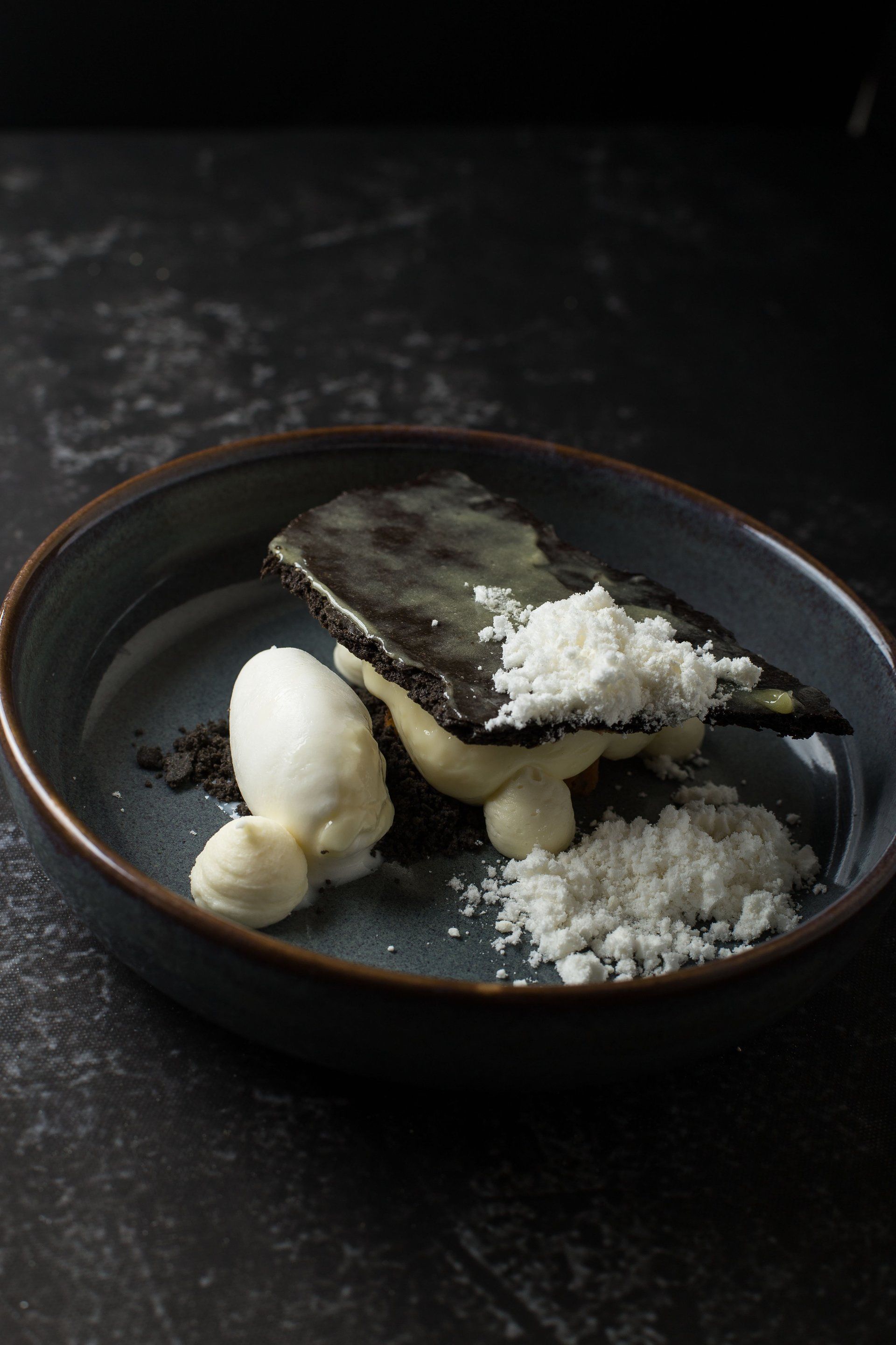 פלפל לימון ושמן זית - עוגת שקדים, קרם לימון, גלידת שוקולד ושמן זית, בצק פלפל שחור פריךButton