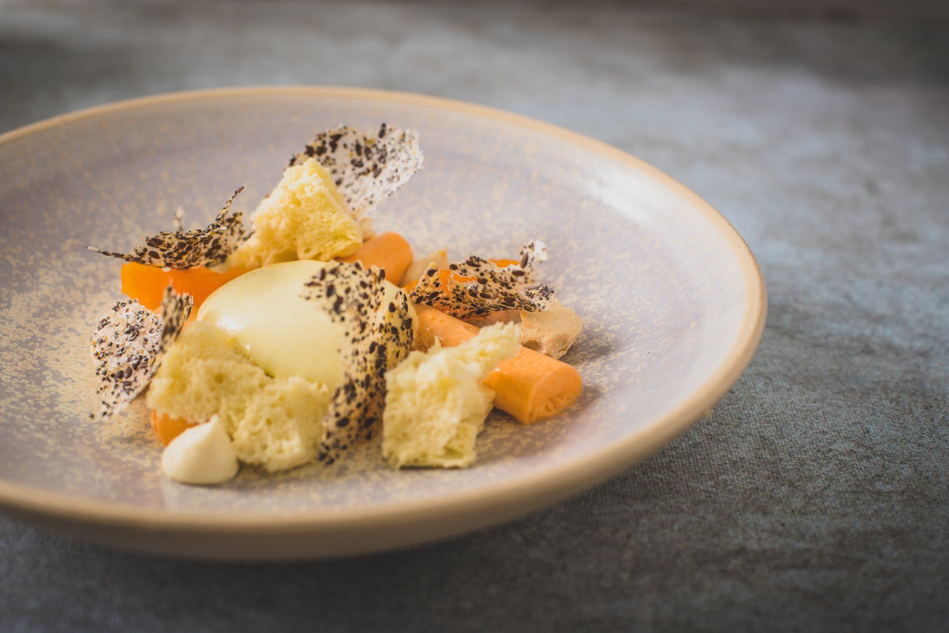 בטטה צלוייה, גלייז תפוז שאטה, קרמבל פחם כרישה וגרעינים, ציר מולים וגרגיר נחלים