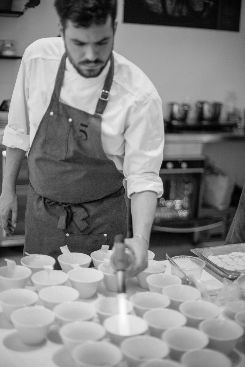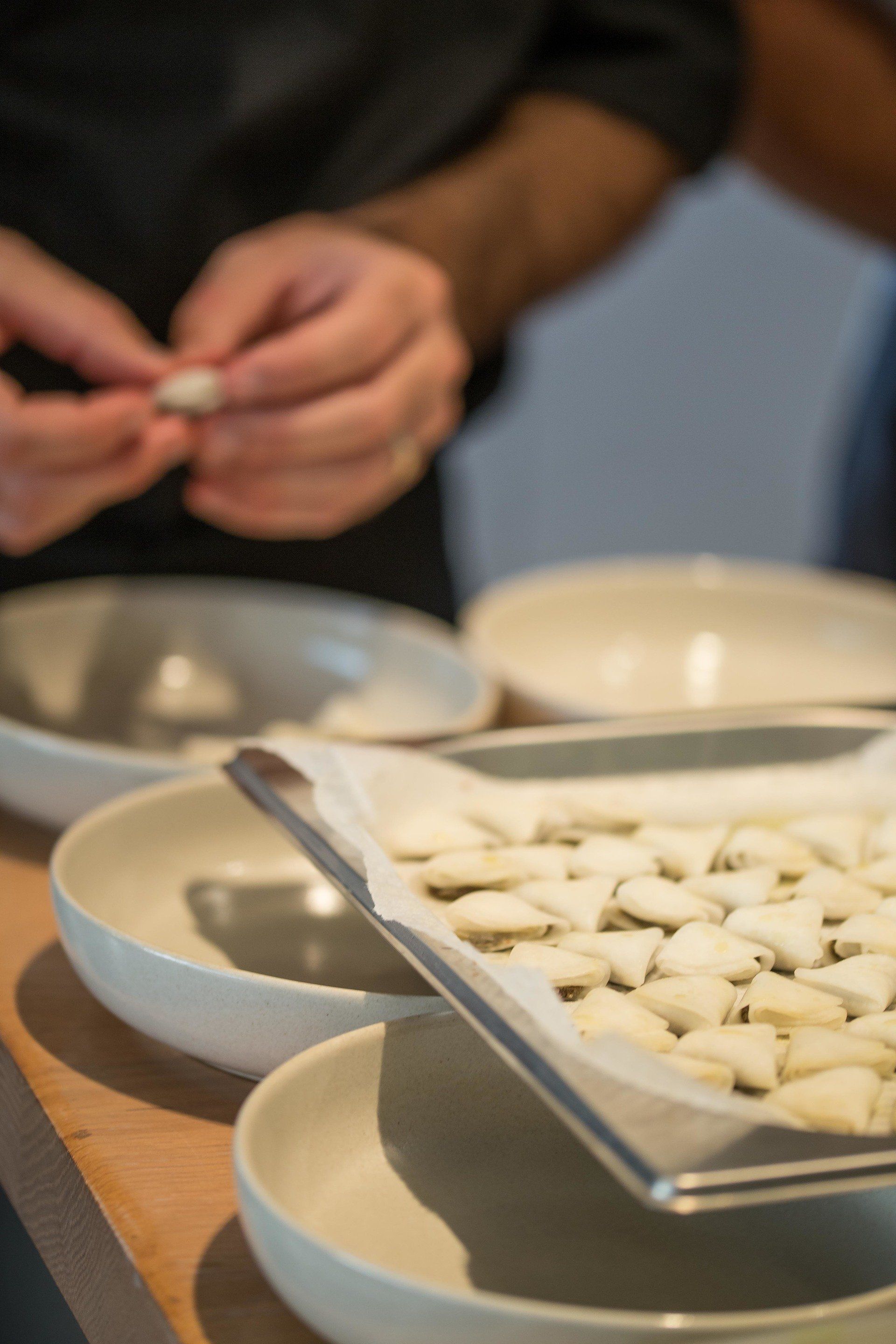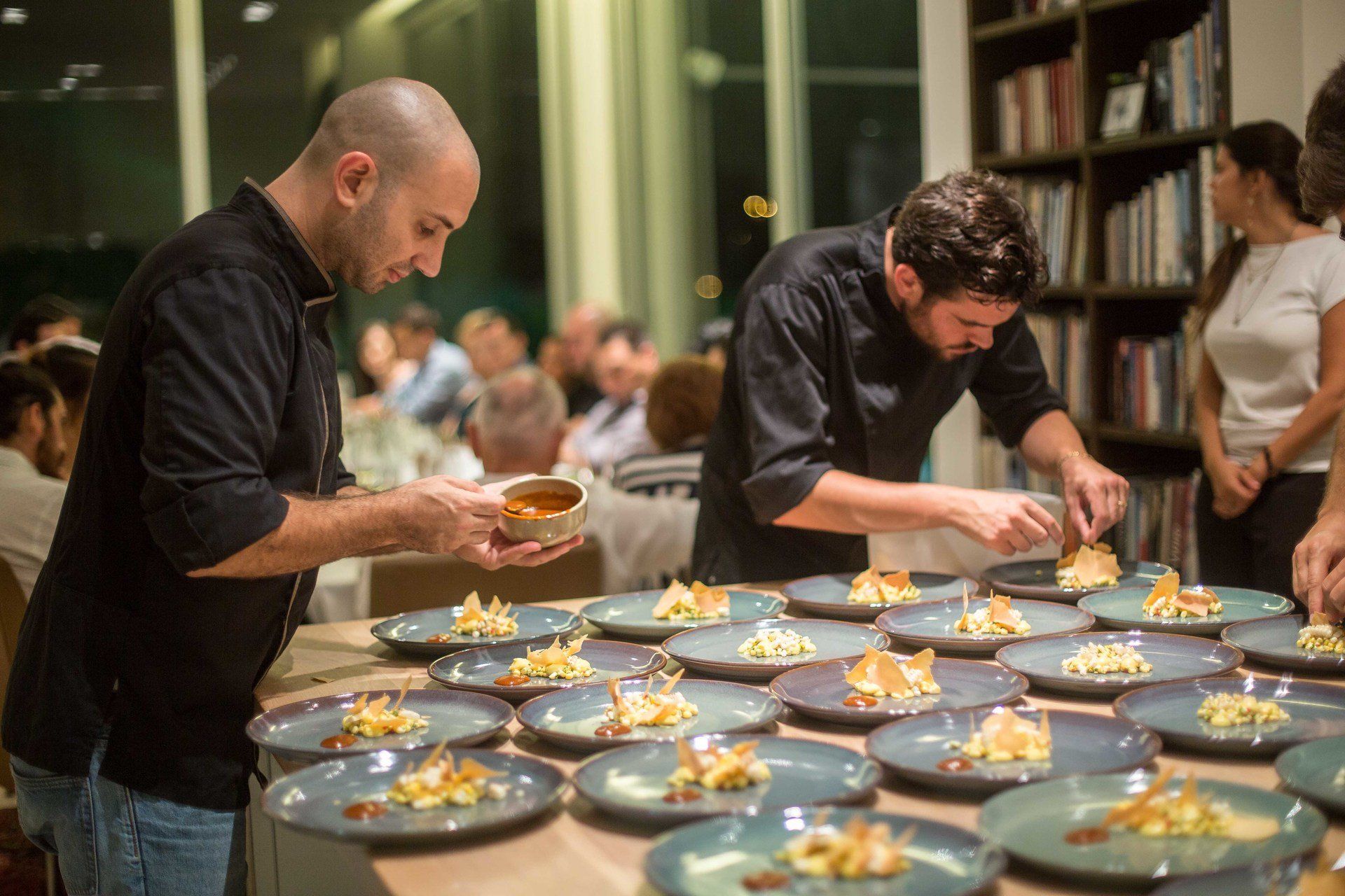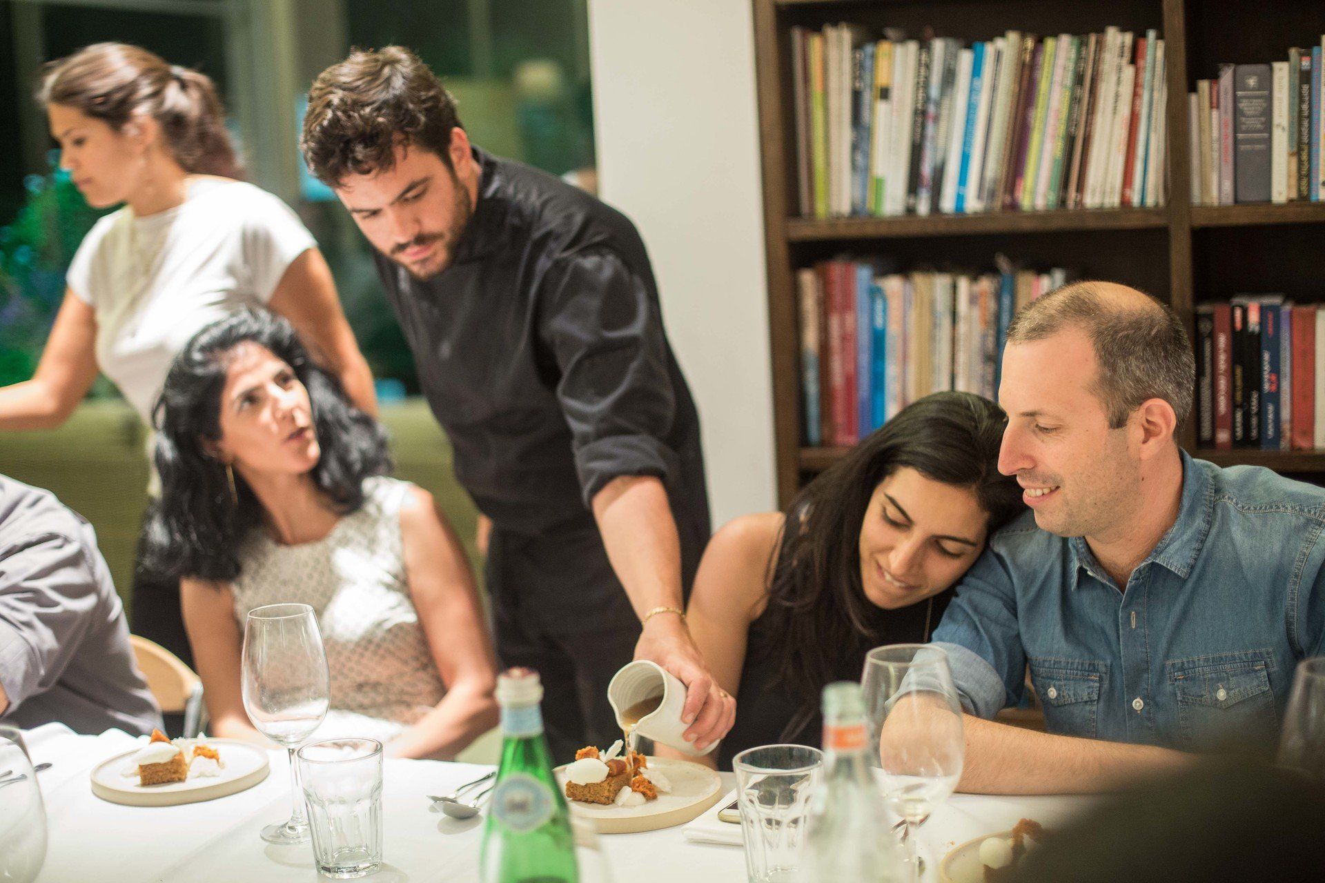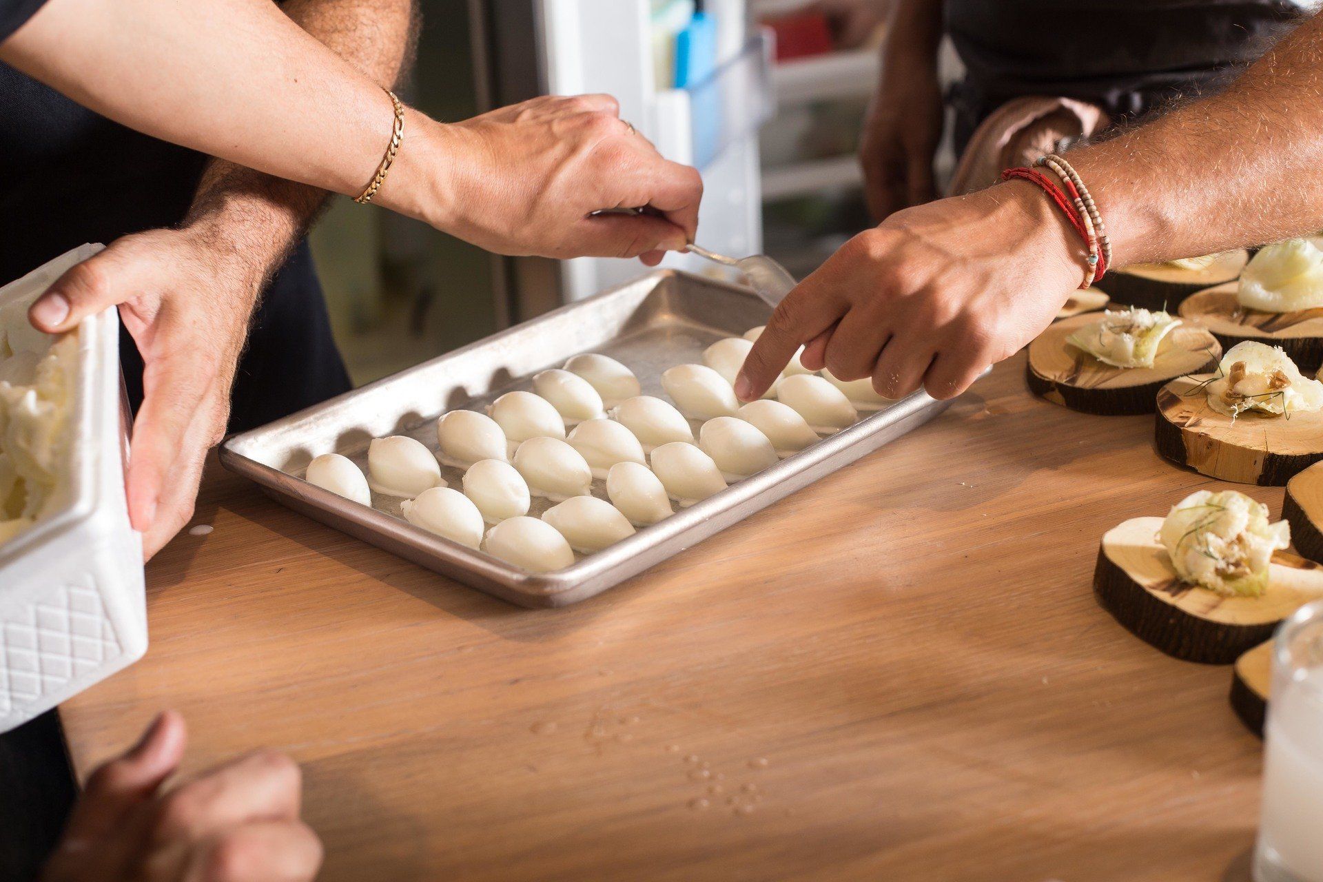 בליני סולת, קרם גזר, פטריות ירדן מעושנות, חלמון כבוש